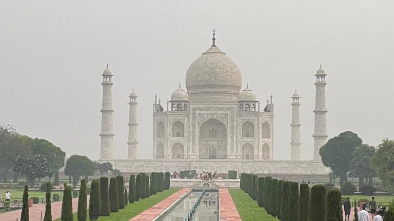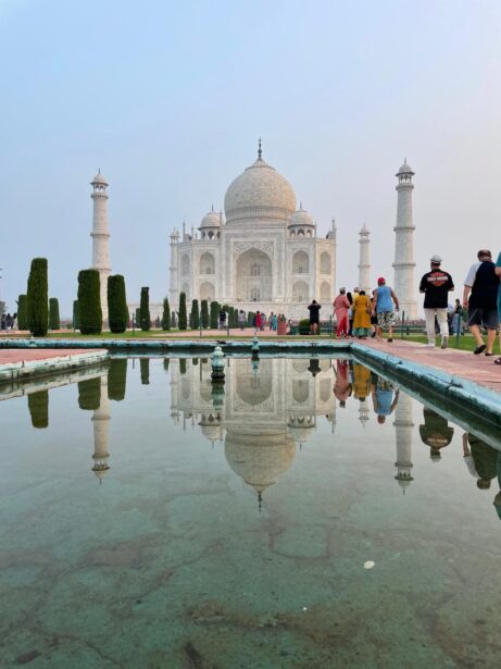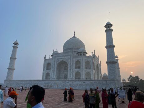 Následoval přesun na jeden den do města Orcha a na jeho památky a následně do Gwalioru, který je vyhlášen za nejvíce smogem znečištěné místo na planetě (no za mě asi autor této statistiky nikdy nebyl v Kathmandú). Osmý den jsme se přesunuly do Agry a blížil se náš vrchol cesty - bájný Taj Mahal. Opět jsme natrefily na super průvodce, který nás vytáhl ráno ve 4 z hotelu, abychom Taj Mahal stihly za svítání a mezi prvními skupinami. Doporučení vzít si něco velmi barevného kvůli efektům fotek jsme dodržely, ale již při vstupu litovaly. Vlhkost byla snad 1000% a teklo z nás horem pádem. Taj Mahal je nedaleko řeky Jamuny a při svítání na podzim v Indii po monzunových deštích počítejte, že z vás poteče jak z konve. Zážitek to byl ale nádherný i tak, ačkoli davy turistů zapomenout nejde.