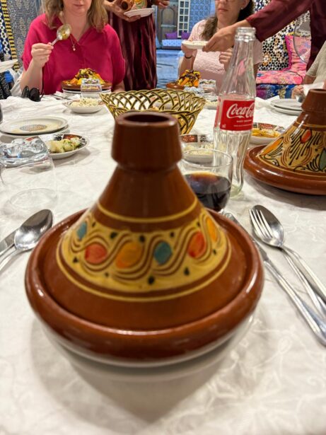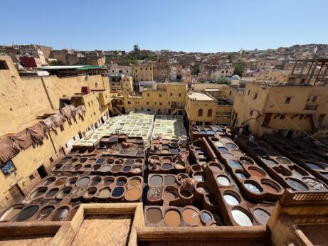 Fez - to je královský palác, židovská čtvrť, návštěva rukodělné výrobny hliněné keramiky, procházka medinou s úzkými uličkami a arabskými krámky a vrcholem samozřejmě byla známá koželužna - jedno z nejčastěji focených míst v Maroku. Před vstupem vyfasujete snítek máty, který při vstupu nepustíte z ruky (respektive od nosu). Připravte se na pohled hodný středověku, zápach, který nechcete identifikovat a pocit, že i to vstávání do kanceláře každý den je vlastně luxus. V krásné restauraci v paláci Riad si pak zlepšíme chuť a dáme si místní specialitu „tažín“ - tentokráte kuřecí. Tajin (tažín) je vlastně hliněný hrnec ve tvaru Ještědu:)), ve kterém se vaří, respektive peče. A to cokoli - zelenina, maso, kuskus,… My dali kuřecí na citronu a nechyběli i chuťovky k tomu - lilky, kuskus, rýže, olivy….Marocká kuchyně je bohatá a jídlo je svátek. Den jsme zakončili stylově - v prodejně s alkoholem při nákupu piva značky Sahara a jednoho místního berberského. Maročané samozřejmě jako správní muslimové nepijí, ale věřte, že v obchodě nebyli jen turisté.