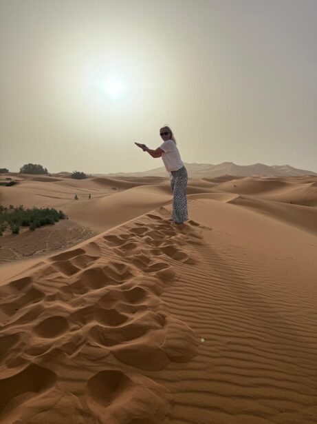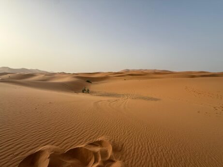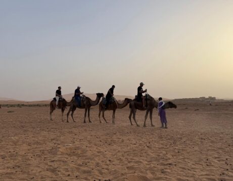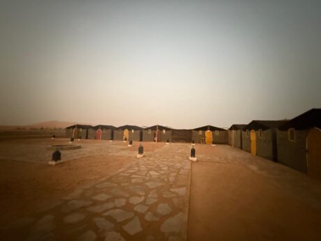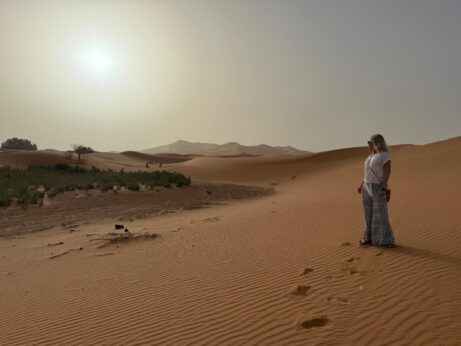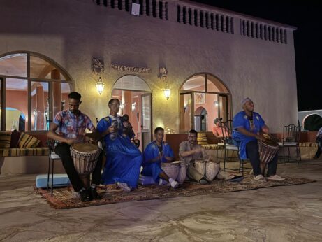 Sobota byla ve znamení přejezdu na Saharu k alžírským hranicím. Přes Chamonix (místní horské středisko, kde je patrný vliv francouzské kolonizace) rovnou do jeepů a na poušť. Noc strávená v poušti v klimatizovaných stanech a večer doprovázený berberskými písněmi u ohně? Ano, ten pravý zážitek. Jen jsme měli trochu smůlu, protože nebyla dobrá viditelnost, spíše opar, takže jsme se shodli, že hvězdy jsou více vidět u nás než na Sahaře. Odvážnější si pak dali jízdu na velbloudech (já jsem po zkušenosti z Egypta ráda vynechala).