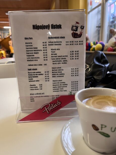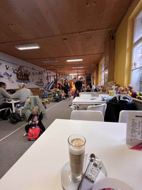 Zatímco Tobi běhal jako tornádo, my jsme si dopřáli chvilku klidu u stolu. Já jsem si dala kávu a punčák, Páťa tiramisu a kávu, a Tobi samozřejmě „kakaa“, jak s oblibou říká. ☕️🍰