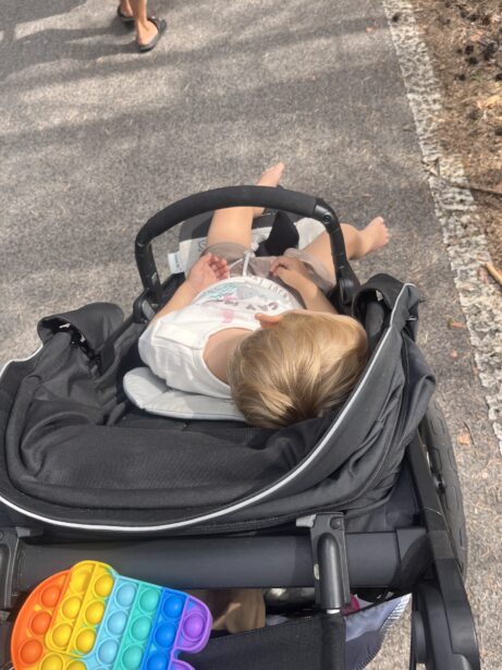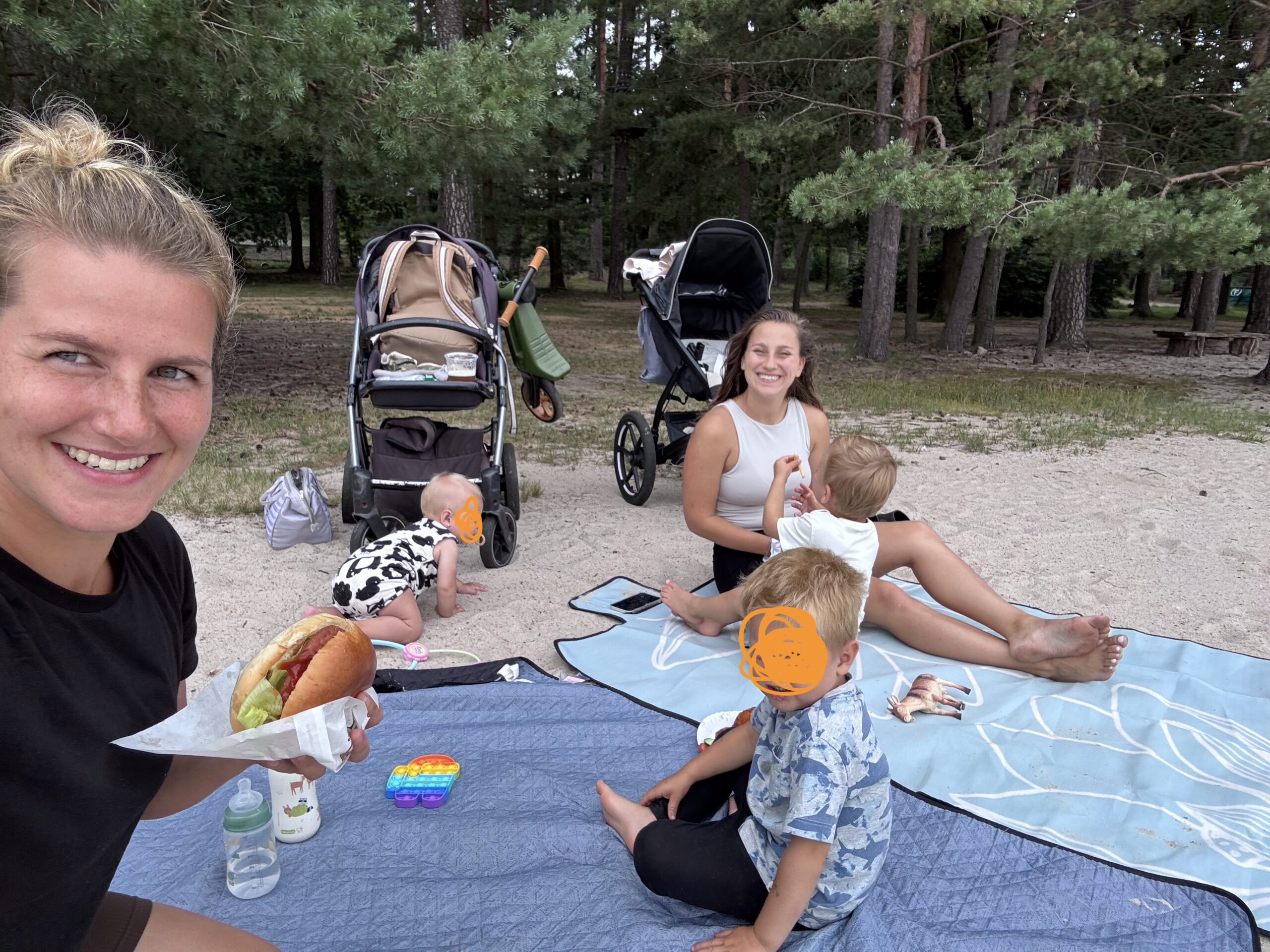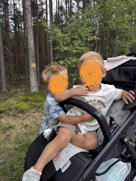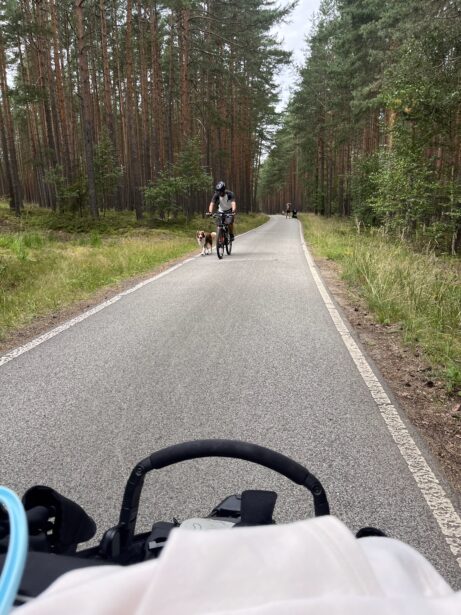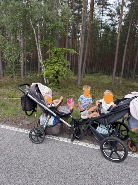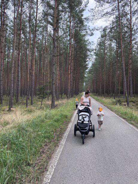 Cesta lesem byla příjemná – stín borovic, rovný povrch vhodný i pro kočárky a k tomu letní ticho, přerušované jen švitořením dětí, rychle jedoucími cyklisty a bruslaři. Po cestě jsme narazily na lesní borůvky, které okamžitě skončily v dětských pusách, a pár hub, které jsme tentokrát nechaly v klidu růst.