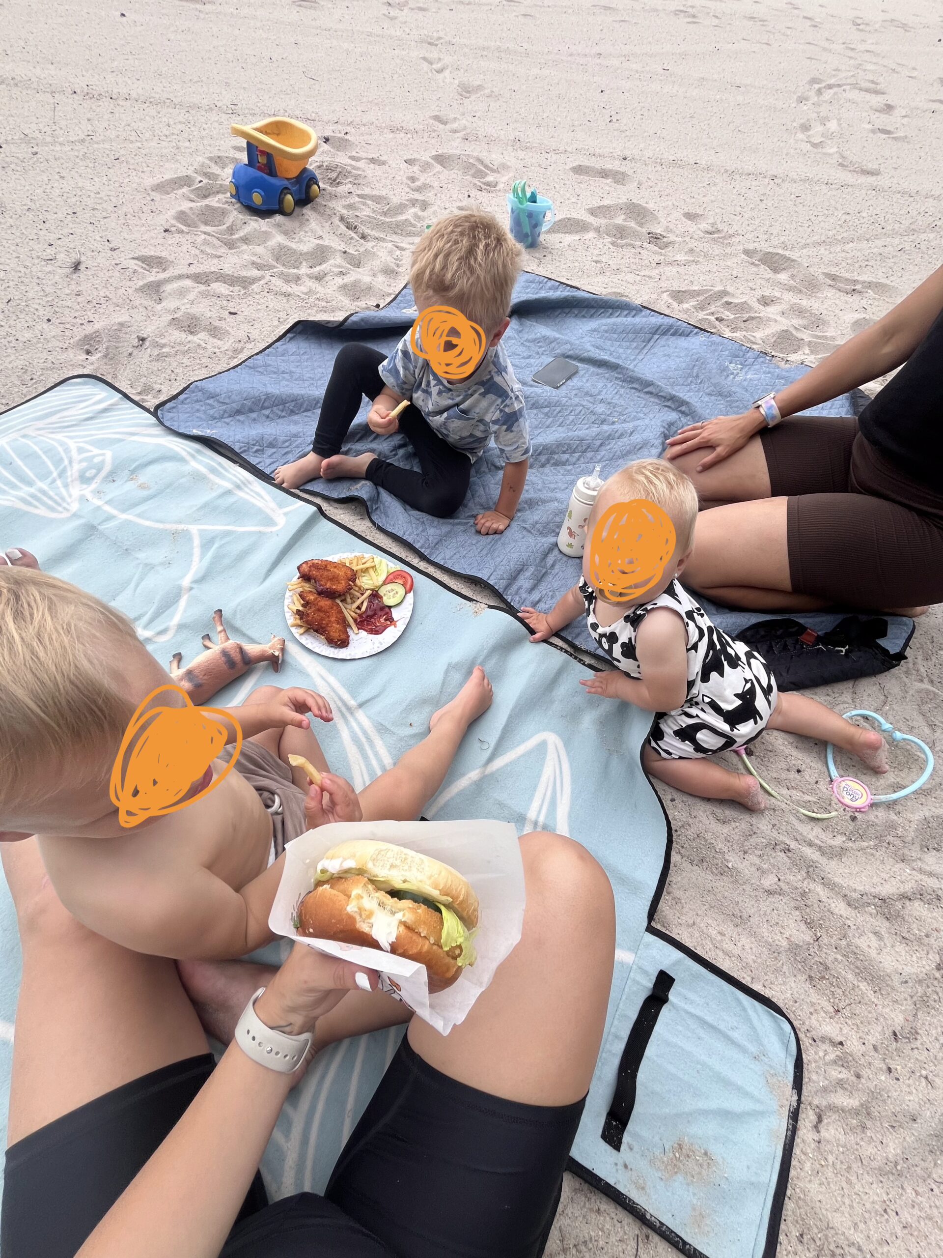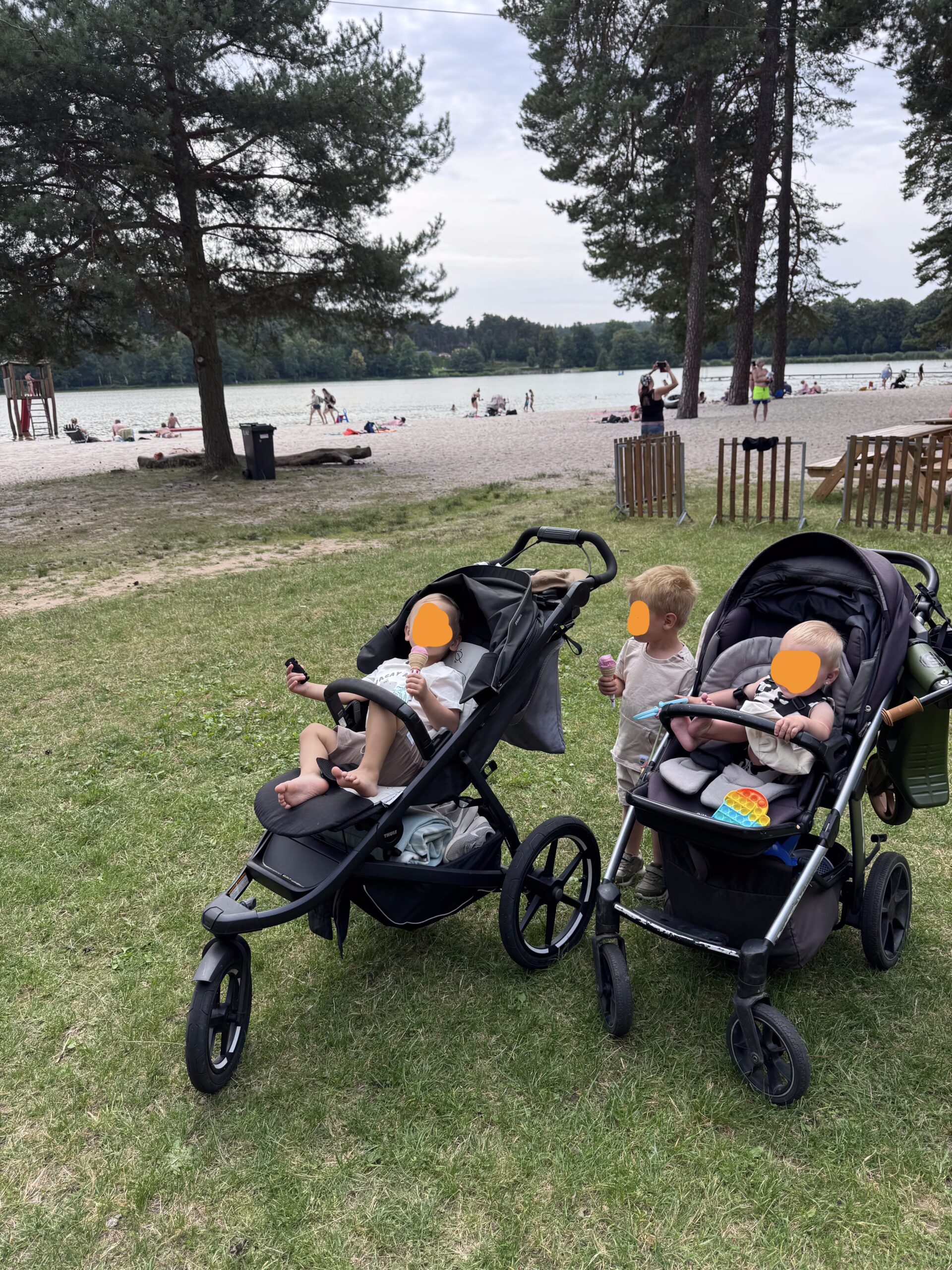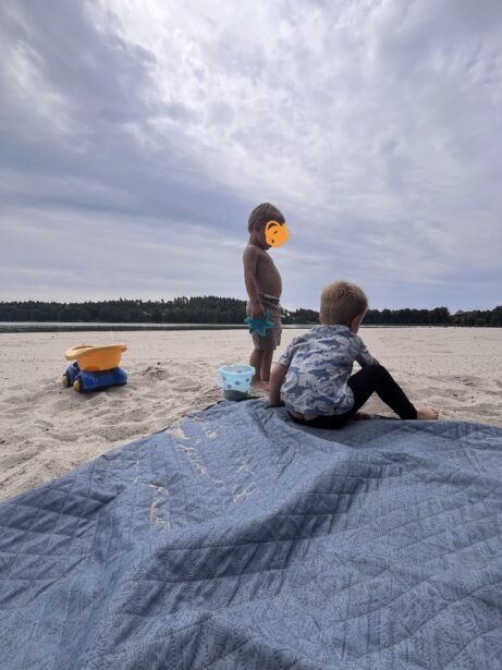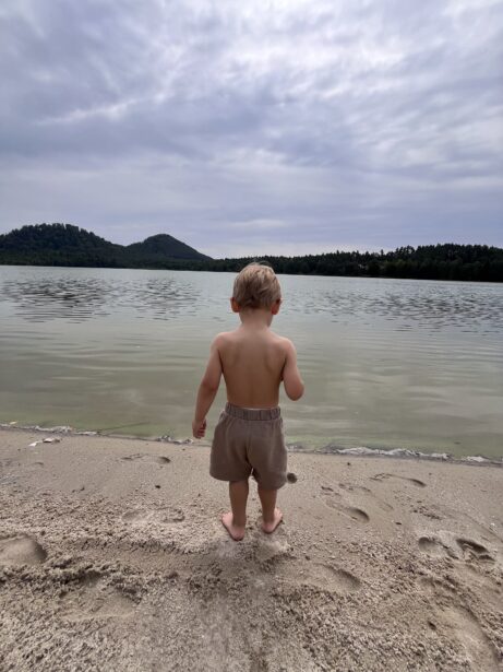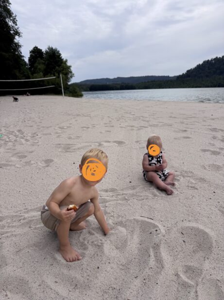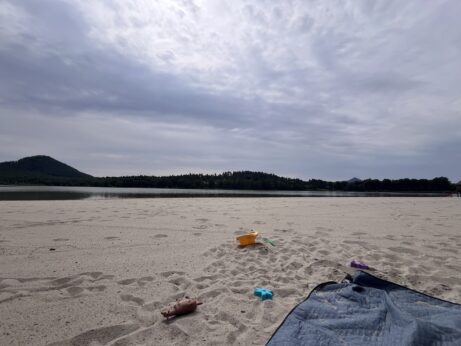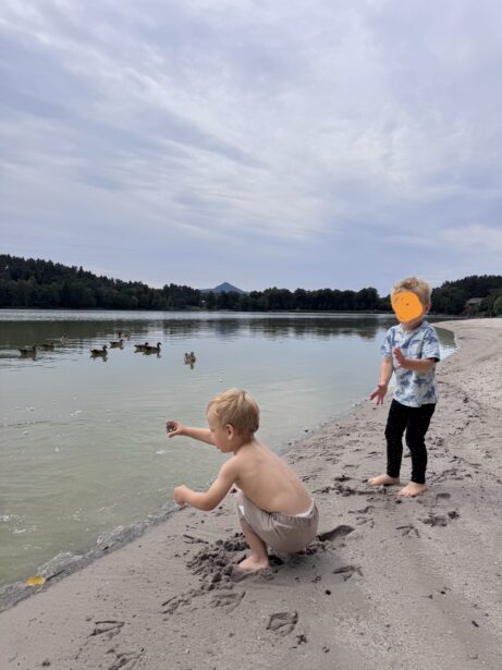 Na pláži jsme si našly místo u vody, děti se okamžitě pustily do průzkumu pláže. Daly jsme si oběd a studený birell. Děti pozorovaly kachny. Voda byla příjemně osvěžující, takže došlo i na krátké smočení nohou – delší koupání jsme tentokrát vynechaly.