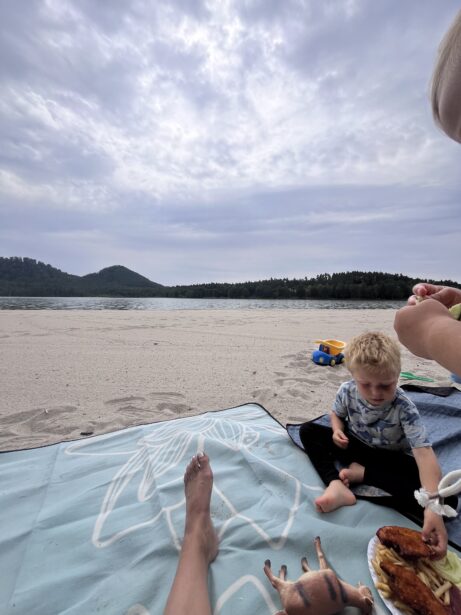 Po příjemné 7km procházce se před námi otevřela pláž Hamerského jezera – jemný písek, klidná voda a borový háj kolem. Místo má skvělou atmosféru a působí, jako by vás na chvíli vytrhlo z každodenního shonu.