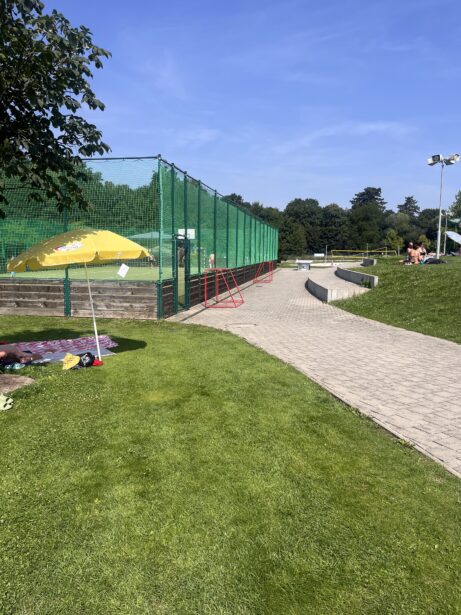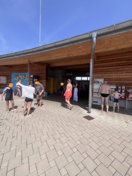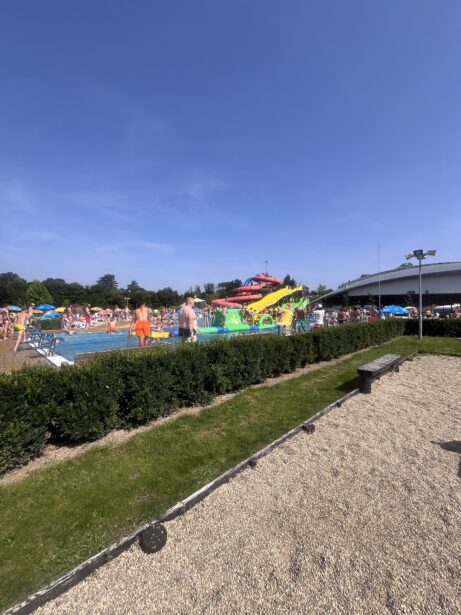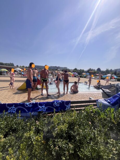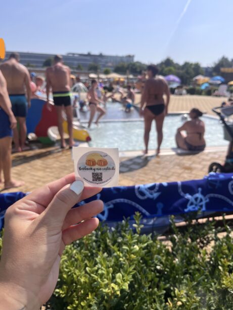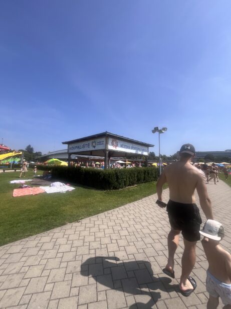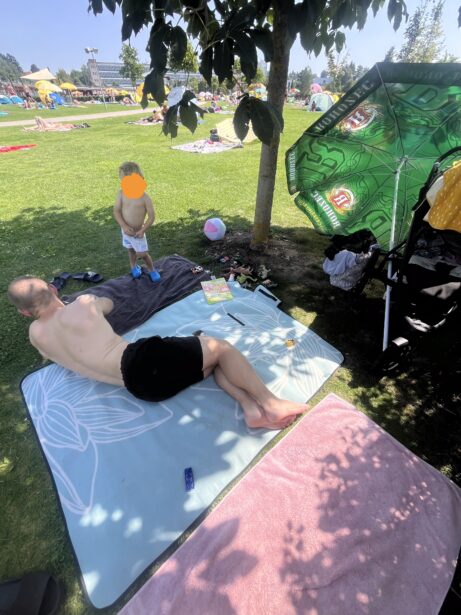 Na koupaliště jsme společně jezdili už loni a tentokrát jsme si řekli, že na to půjdeme chytře – přijedeme už kolem desáté ráno, než se koupaliště zaplní. Tahle strategie se vyplatila, protože jsme ulovili úplně parádní místo pod velkým stromem na trávníku. Tam jsme rozložili všechno naše „letní stěhování“ – deku, tašku plnou hraček, míč a svačinu na přežití celého dne.